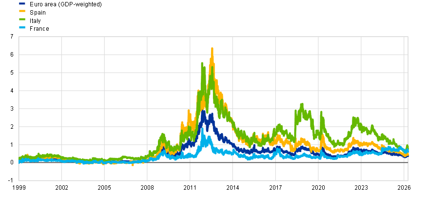 Notes: The spread is the difference between the ten-year sovereign yields of individual countries and the ten-year yield on German Bunds. The latest observations are for 16 April 2026.