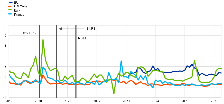 Notes: The chart shows the time series of market liquidity (average bid-ask spreads in basis points). For individual euro area countries and the EU (European Commission), the monthly average of the bid-ask spreads of the respective benchmark bond yields is shown. The vertical lines refer to February 2020 (“COVID-19”), September 2020 (Support to mitigate Unemployment Risks in an Emergency, “SURE”) and May 2021 (Next Generation EU, “NGEU”). The latest observations are for 16 April 2026.