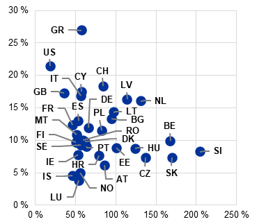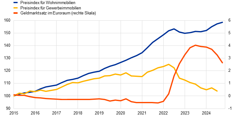Die Banken in Europa erwiesen sich ungeachtet des schwierigen außenwirtschaftlichen Umfelds weiterhin als widerstandsfähig. Gestützt durch hohe Zinserträge und verkraftbare Kosten verzeichneten sie 2024 Rekordgewinne. Ihre Widerstandsfähigkeit könnte jedoch künftig durch makrofinanzielle Herausforderungen auf den Prüfstand gestellt werden. Dadurch ergeben sich potenzielle Risiken, beispielsweise ein Finanzierungsdruck und eine Verschlechterung der Qualität der Aktiva. Diese könnten insbesondere bei Banken zum Tragen kommen, die umfangreiche Risikopositionen gegenüber dem Gewerbeimmobiliensektor oder gegenüber Unternehmen mit einer starken Abhängigkeit vom Exportgeschäft aufweisen. In mehreren EU-Ländern resultierten aus erhöhten öffentlichen Schuldenquoten Anfälligkeiten, die die Fähigkeit dieser Länder verminderten, künftige Schocks abzufangen.