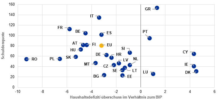 Öffentliche Schuldenquote und Haushaltsdefizit/-überschuss im Verhältnis zum BIP in der EU