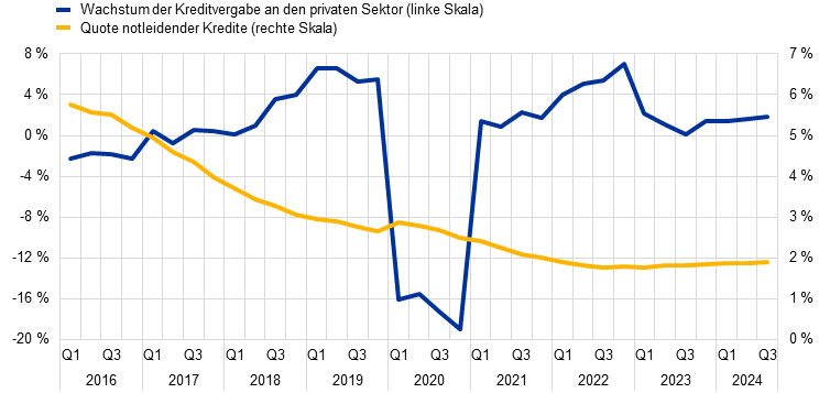 Wachstum der Kreditvergabe an den privaten Sektor und Quote notleidender Kredite in der EU